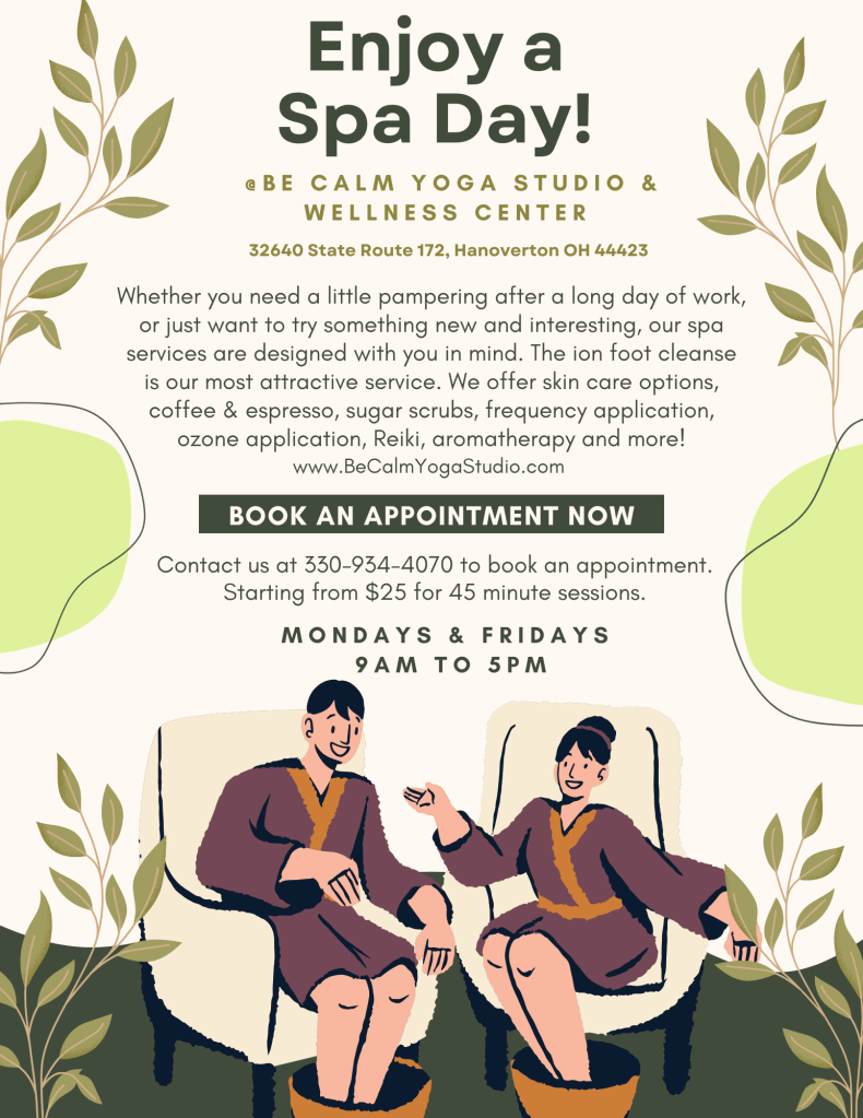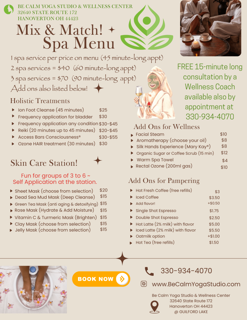 Book your appointment time in advance by calling or texting 330-934-4070. Taking appointments starting at 9am and ending at 5pm. (Individual appointments for services also available Monday through Saturday by appointment only.)