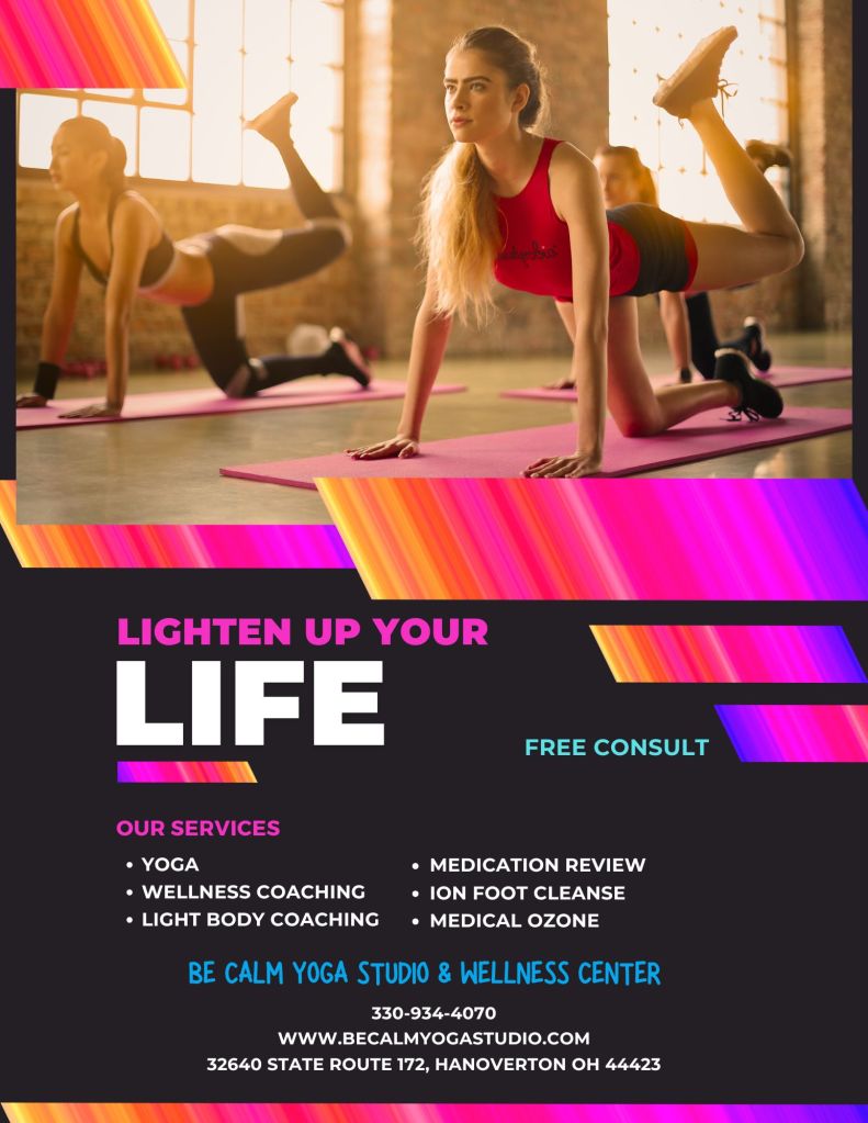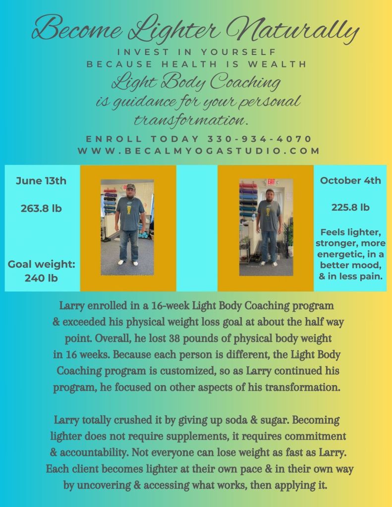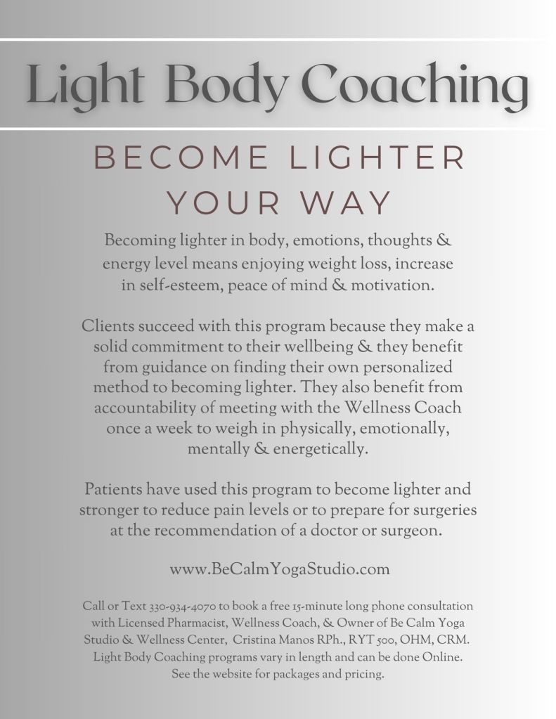 Investing in yourself is the key to unlocking a healthier, happier you. My programs are designed to support you every step of the way, ensuring that you feel better, move better, and live better. Join us at Be Calm Yoga Studio and Wellness Center or Online for Light Body Coaching and start your journey towards a lighter, more vibrant life.