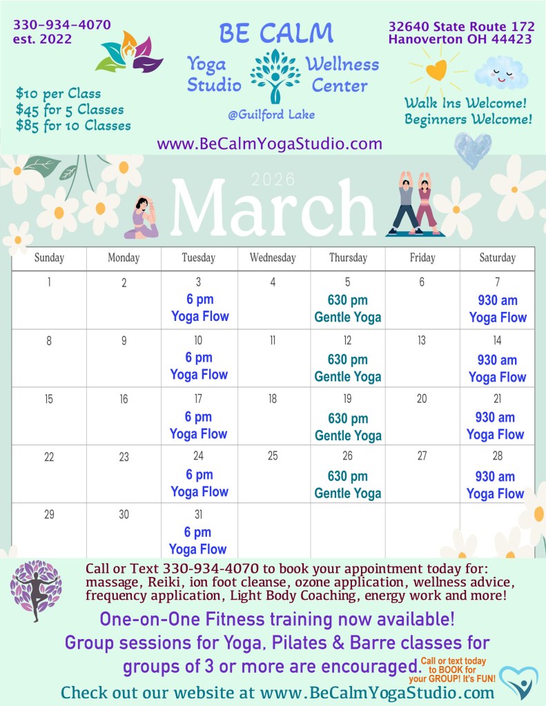At Be Calm Yoga Studio & Wellness Center we encourage you to make it to your mat for Yoga or Pilates and we support you in all your wellness endeavors no matter where you live. We genuinely care about your personal wellbeing and your healing and personal growth. Our studio is here to help you meet any goals you have for yourself, even if they are private. One of the best things about Yoga, Pilates and any kind of movement is that you can silently process and release tension. You don’t have to talk about it.